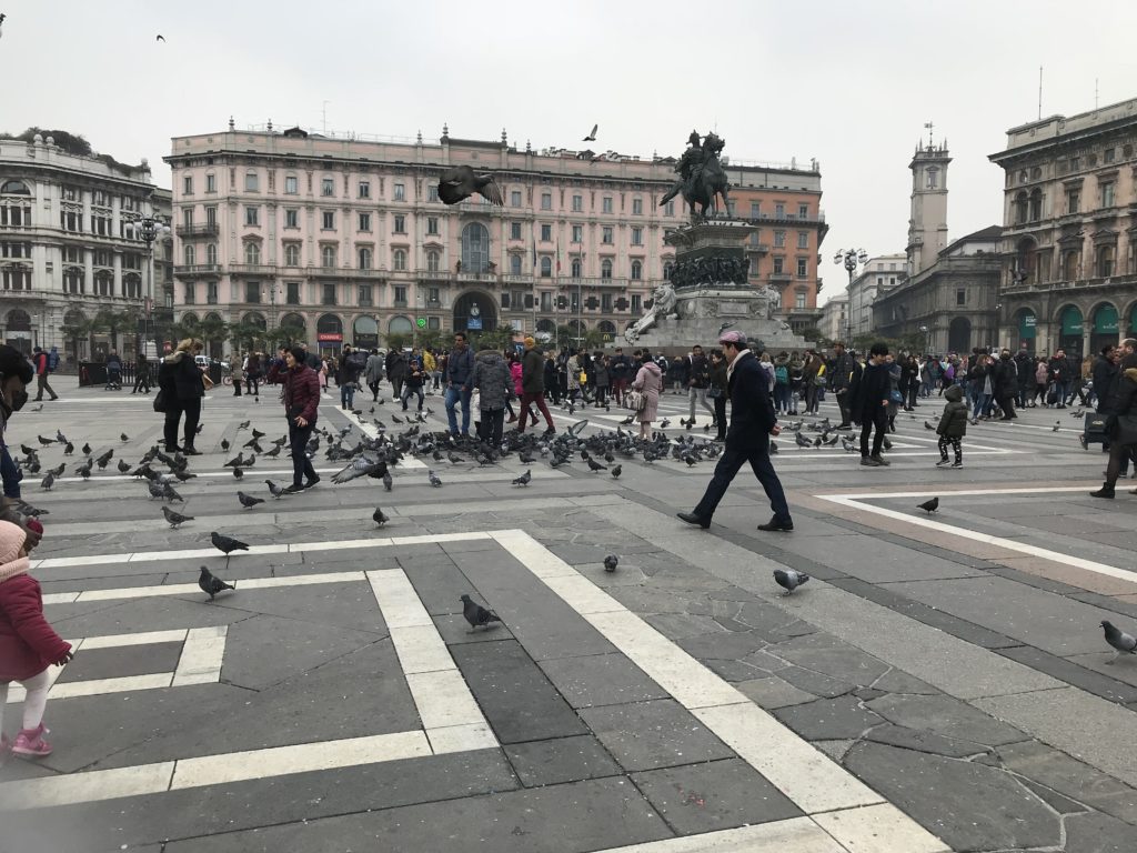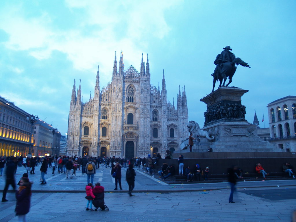 Prostor kolem je opět velkolepý a pohled na katedrálu je neuvěřitelný. S únorovým, zamračeným, tmavým nebem na pozadí je Duomo až středověce zlověstné. Genius loci se zde nedá zapřít. Co mi kazí dojem je přítomnost černochů u každého východu z náměstí či hlubin zdejšího metra, aby na mě házeli pletené náramky a snažili se ze mě vymámit co nejvíce eur. Nejeden náramek mi přistál na rameni s tím, že mám zaplatit 20 €. Nechovají se nebezpečně, ale je jich vždy pospolu několik a zahrazují cestu všem, co kolem nich musí nutně projít. Okolo stojící vojáci a policisté, kteří ve městě hlídkují u turistických míst, tomu všemu jen přihlížejí. Další aspekt, který je na ulicích centra nepřehlédnutelný, je počet žebravých bezdomovců. Jsou téměř na každém z konců ulic a u každého z kostelů.