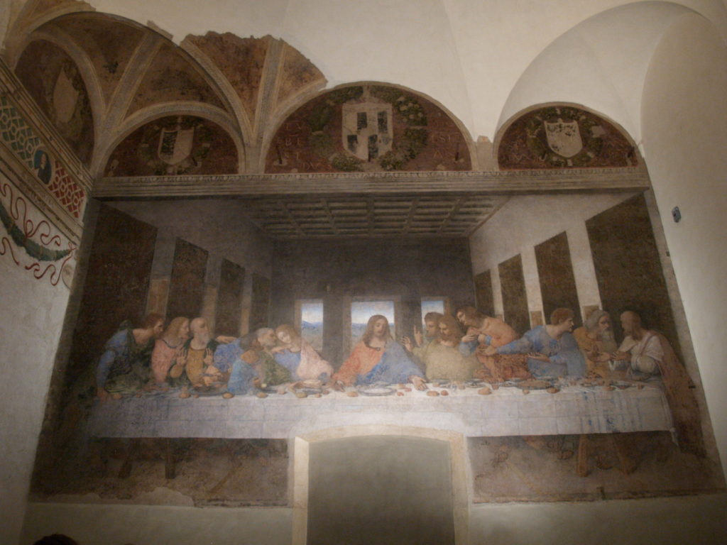 Stihnu projít ještě kostel, ve kterém probíhají modlitby. Je čas. Vydávám se do mé, vlastní, patnácti minutové skupinky a dostává se nám poučení o nutnosti dodržování souboru pravidel chování, v místnosti s dílem velkého mistra. Atmosféra za tmavými, elektronicky ovládanými dveřmi, by se dala přirovnat ke mši svaté. Mezi lidmi je ticho a občas je slyšet šepot. Máme čtvrt hodiny k tomu, abychom si užili toto dílo a místnost, ve které je Poslední večeře „doma“. Devadesát procent mé skupinky má hotovo ani ne za půlku času, včetně desítek fotek z různých úhlů a už postávají u výstupních dveří. Vzhledem ke 120€, které stály dva lístky na tuto tichou show, se mi čtvrt hodiny jako dlouhá doba nezdá. Alespoň mám šanci si to naplno užít. Personál zanedlouho dává pokyn k opuštění místnosti, protože na druhé straně tmavých skel, se tiskne dalších pár šťastlivců, kteří chtějí také svých patnáct minut. Za dveřmi nás čeká velká dotyková televize, kde je dílo zobrazeno ve vysokém rozlišení, a vy si tak můžete dotykem zvětšit či oddálit jakoukoliv část díla, které jste měli před malou chvíli před sebou. Skvělé a tleskám! Vědět to, tak si večer předtím přehraji začátek filmu Šifra mistra Leonarda.